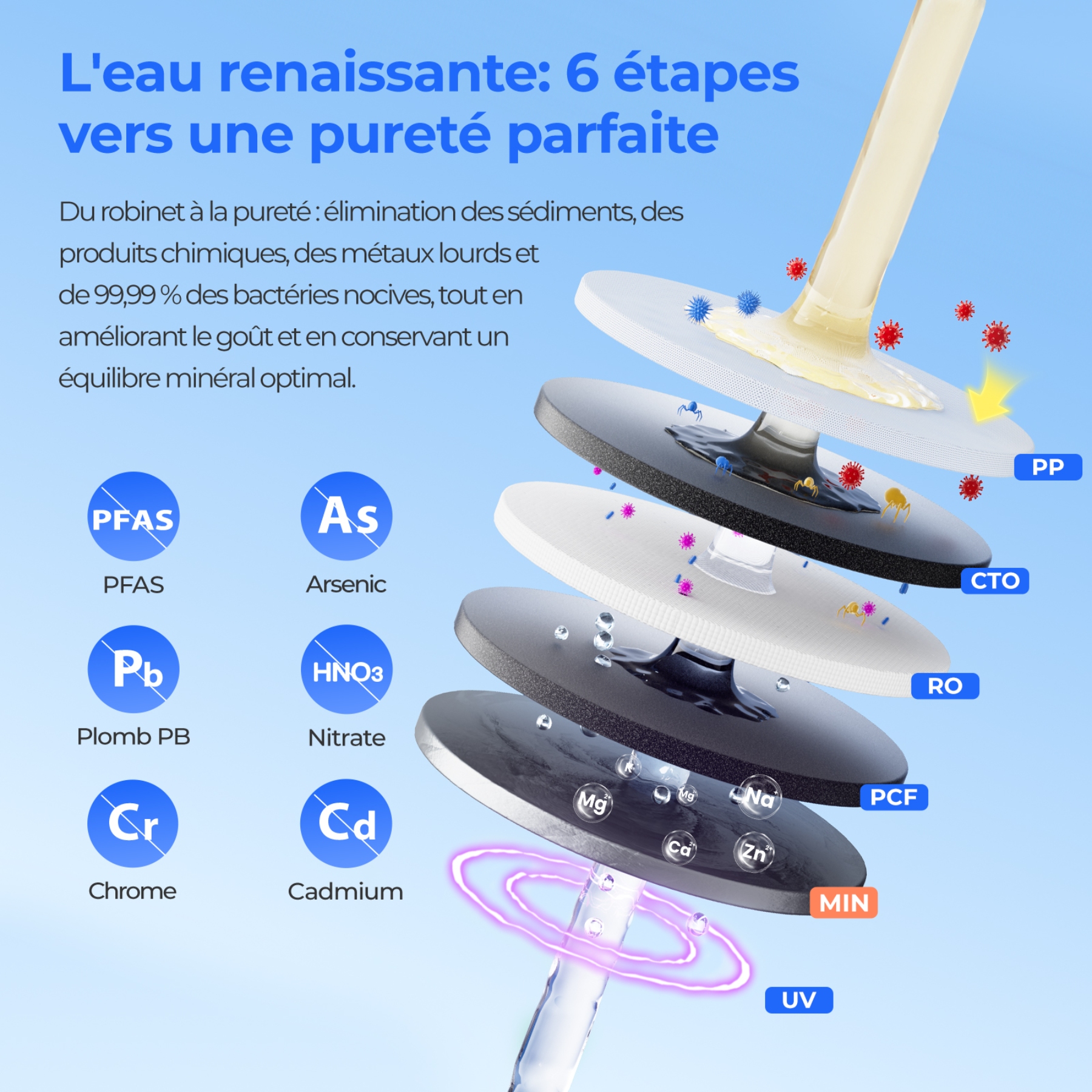 Filtration 6 étages + UV – Membrane RO 0,0001 μm, élimination des métaux lourds, chlore, bactéries