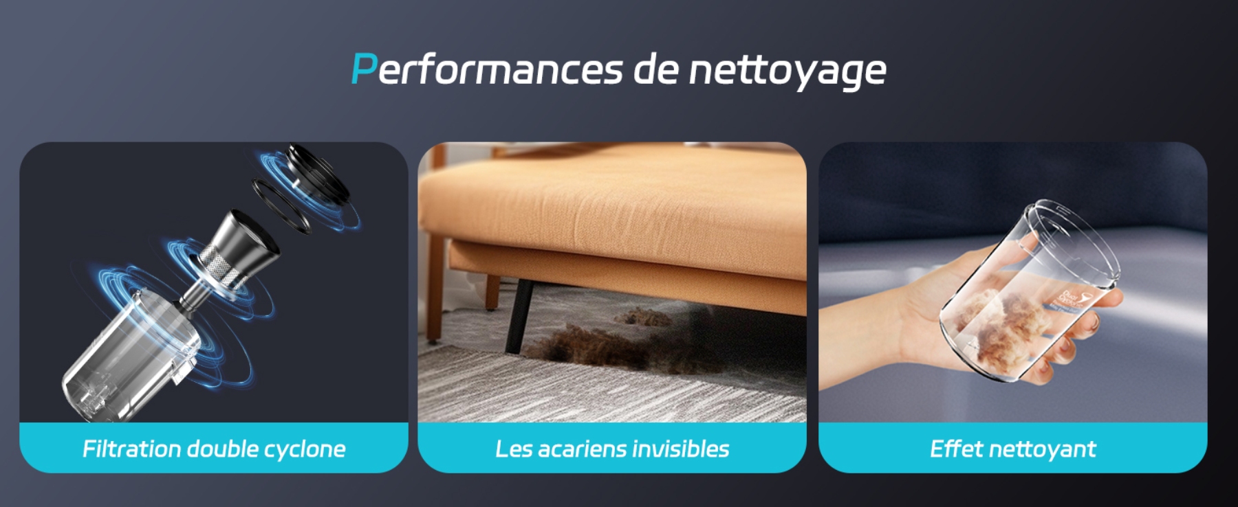 - Capteur de poussière LED : Visualisation en temps réel de la propreté.