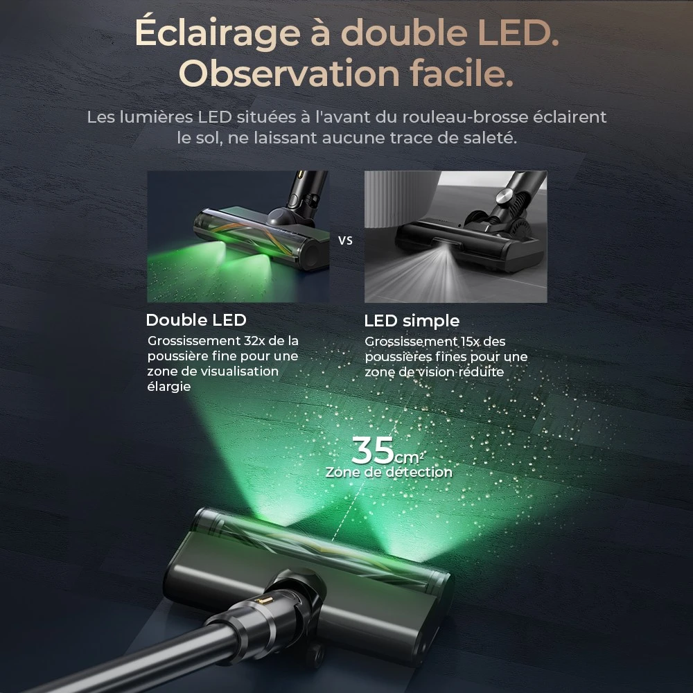 - 3 modes de puissance : ECO (sols durs), Moyen, Max (tapis).