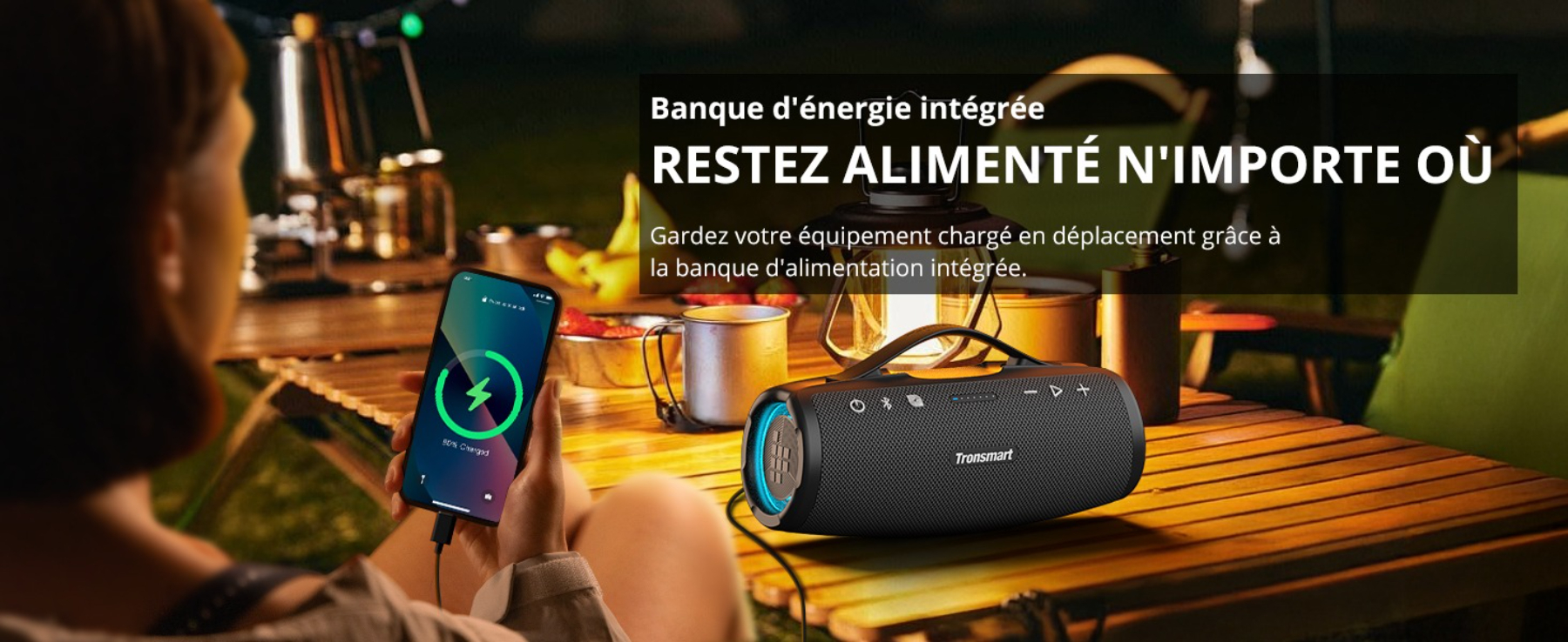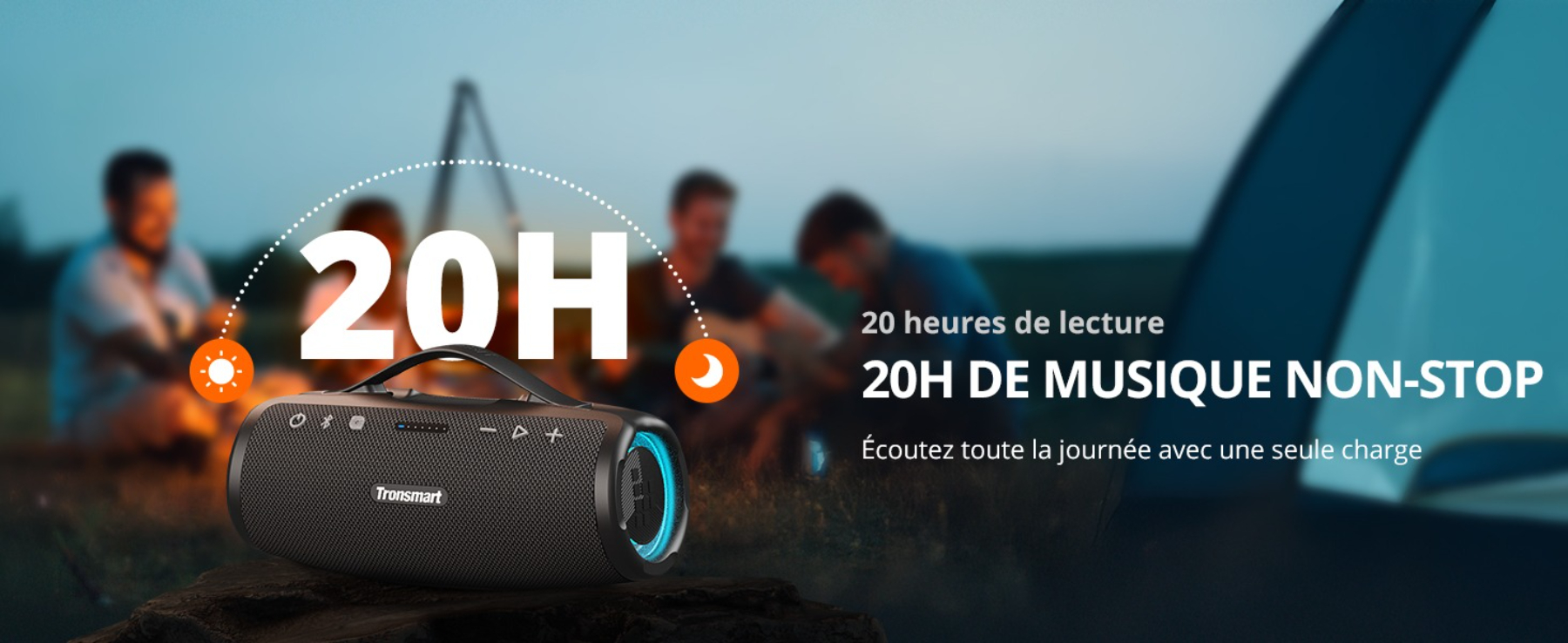Partez à l'aventure avec la Tronsmart Mirtune S100 ! Son son puissant (50W), sa conception étanche IPX7 et son autonomie de 20h en font l'enceinte parfaite pour le camping, la plage ou les fêtes. Rechargez vos appareils grâce à sa batterie intégrée. En savoir plus.