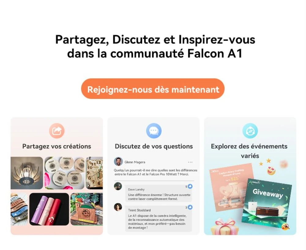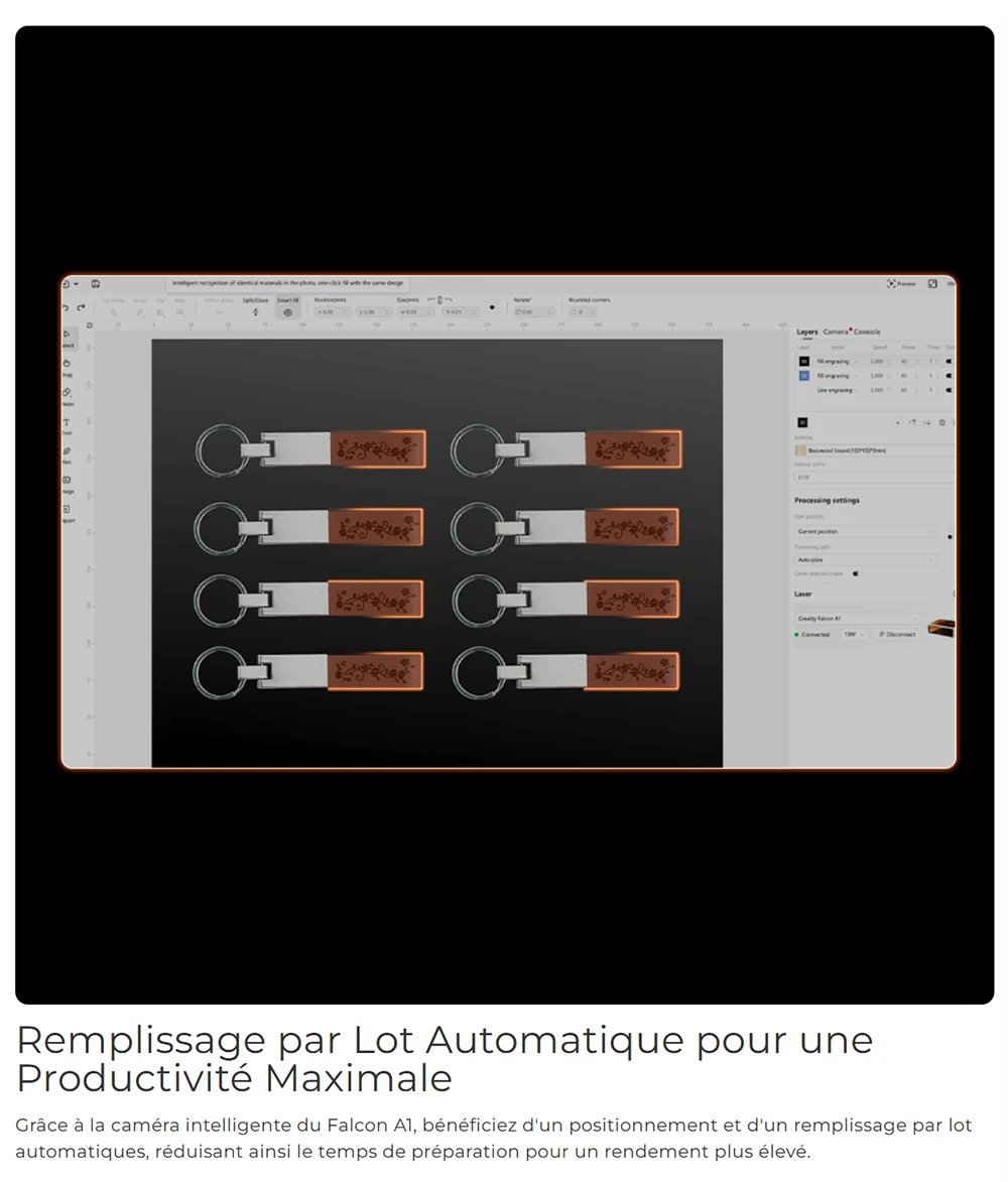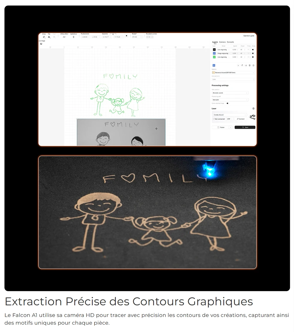 Doté d'une vue plein cadre et d'une caméra haute définition pré-étalonnée, le Falcon A1 simplifie l'ensemble du processus d'utilisation. Dès le début, chaque étape d'utilisation de la machine est simple et intuitive. Il n'est pas nécessaire de procéder à des réglages manuels complexes, ce qui le rend accessible même aux débutants.