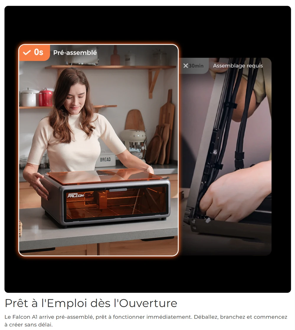 Le Falcon A1 est livré pré-assemblé, ce qui signifie que vous pouvez éviter le processus d'installation compliqué. Par rapport à d'autres machines, il vous fait gagner jusqu'à 95 % du temps d'installation. Il suffit de le déballer et vous êtes prêt à commencer à créer.