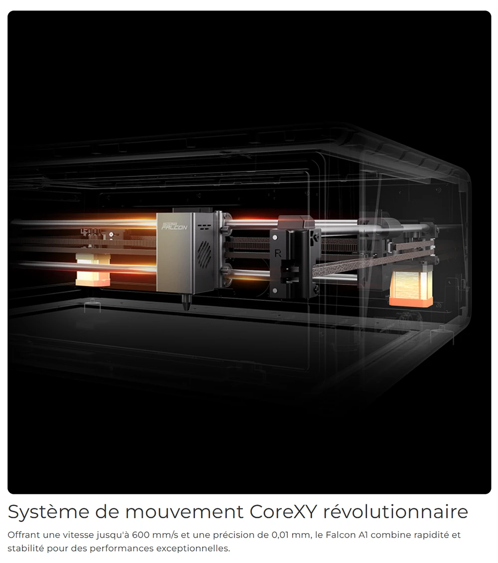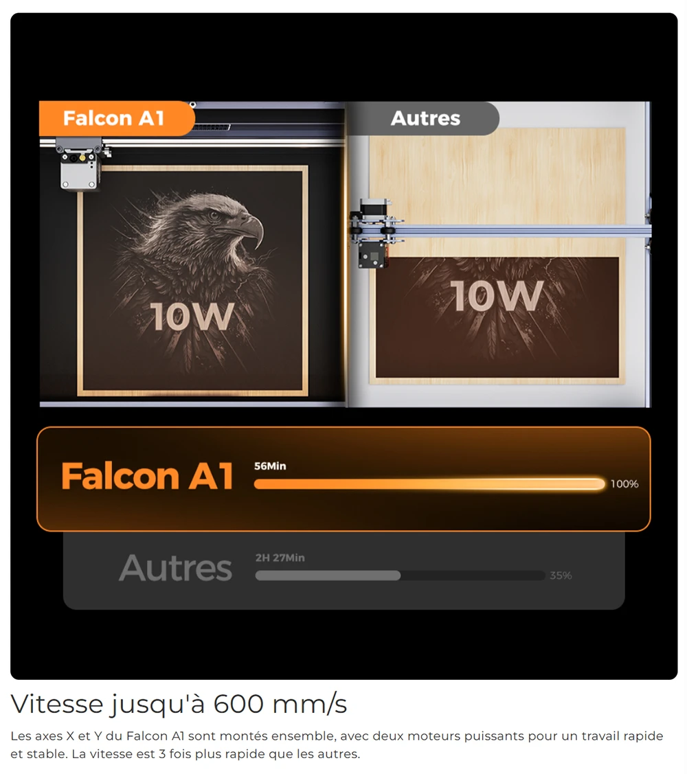 Alimentée par le nouveau système de mouvement CoreXY avec deux moteurs, la Falcon A1 peut atteindre des vitesses allant jusqu'à 600 mm/s. Ces performances à grande vitesse garantissent un fonctionnement fluide, permettant des tâches de gravure et de découpe efficaces et rapides.