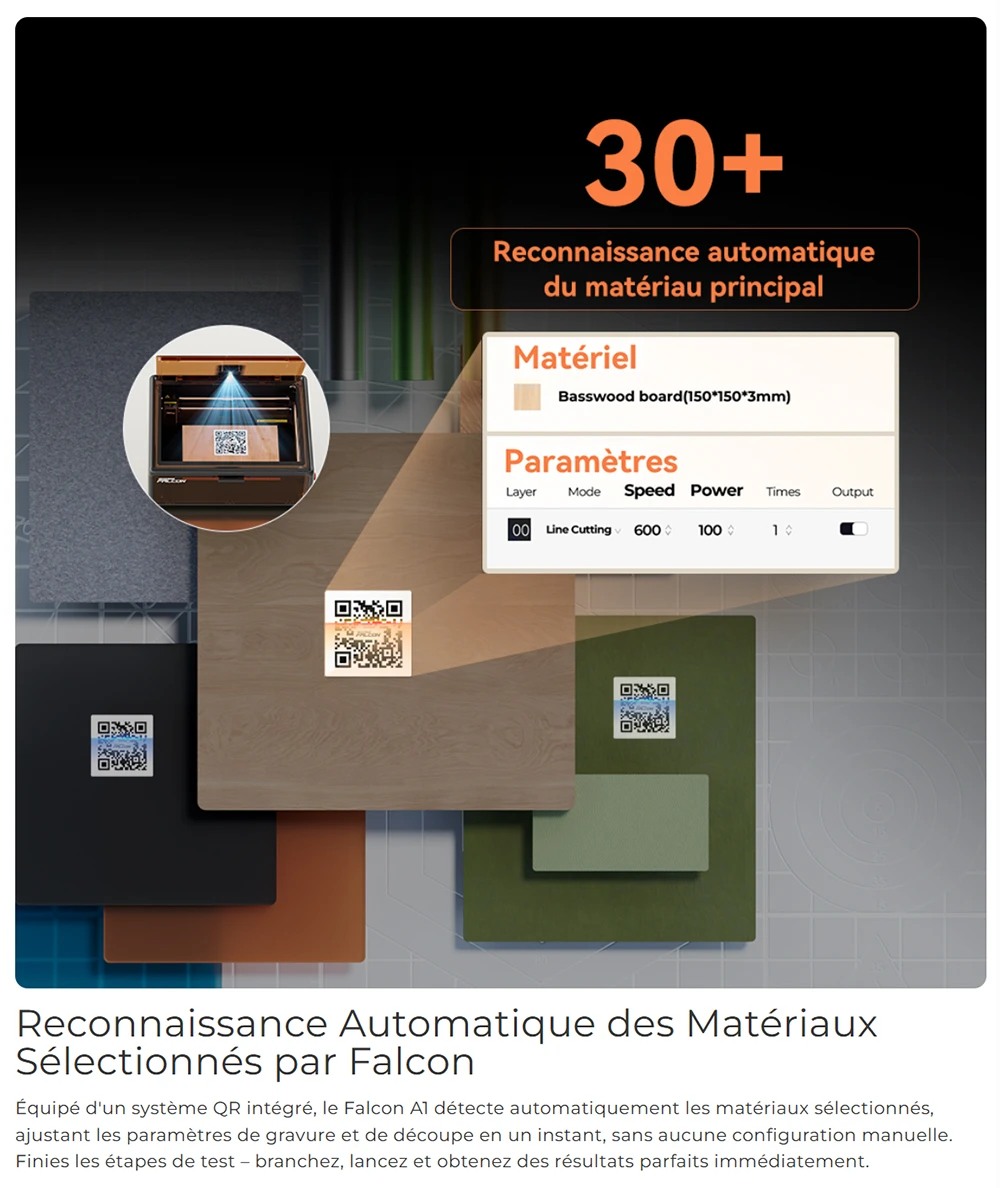 La Creality Falcon A1 10W est équipée d'un système de code QR intégré. Cela permet à la machine de détecter automatiquement les matériaux sélectionnés par Falcon. Une fois le matériau reconnu, elle peut optimiser les paramètres de gravure et de découpe sans aucune configuration manuelle requise. Dites adieu aux tests chronophages ; branchez simplement la machine et elle est prête à produire des résultats parfaits immédiatement.