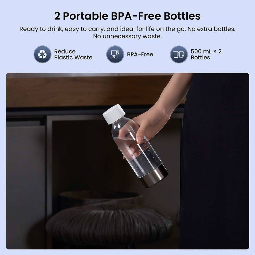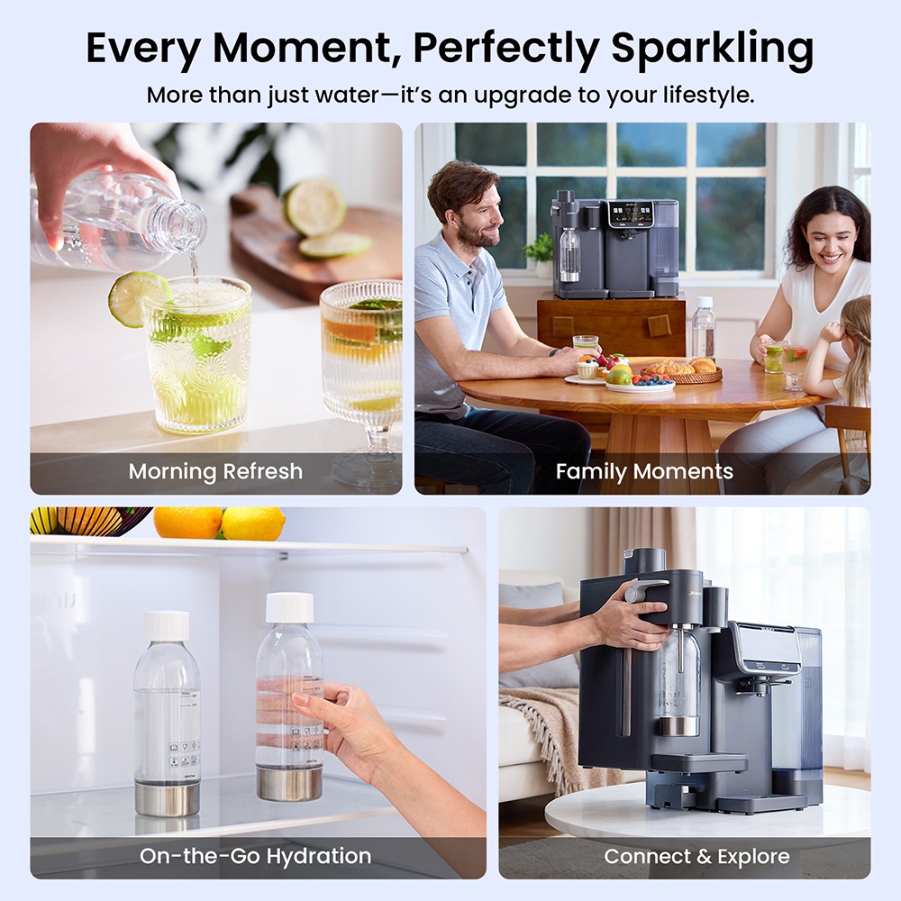 - Système CO₂ haute capacité: Une seule cartouche produit jusqu'à 60 litres d'eau pétillante, réduisant ainsi la consommation de bouteilles en plastique et les coûts liés aux boissons.