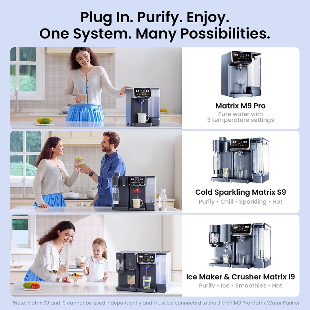 - Système modulaire AquaLink: S'intègre parfaitement au JIMMY Matrix M9 Pro pour une fontaine à eau et à eau pétillante plus complète.