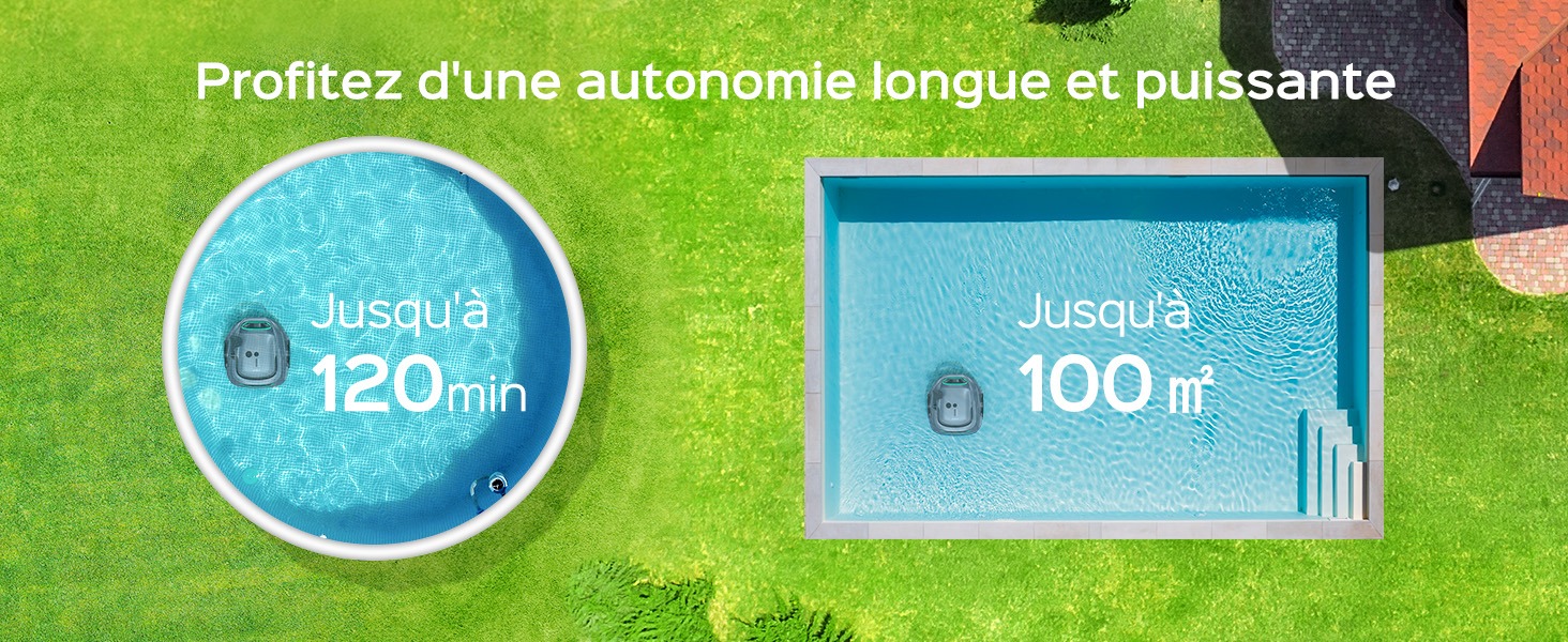 - 120 min d'autonomie – Parfait pour piscines hors-sol à fond plat