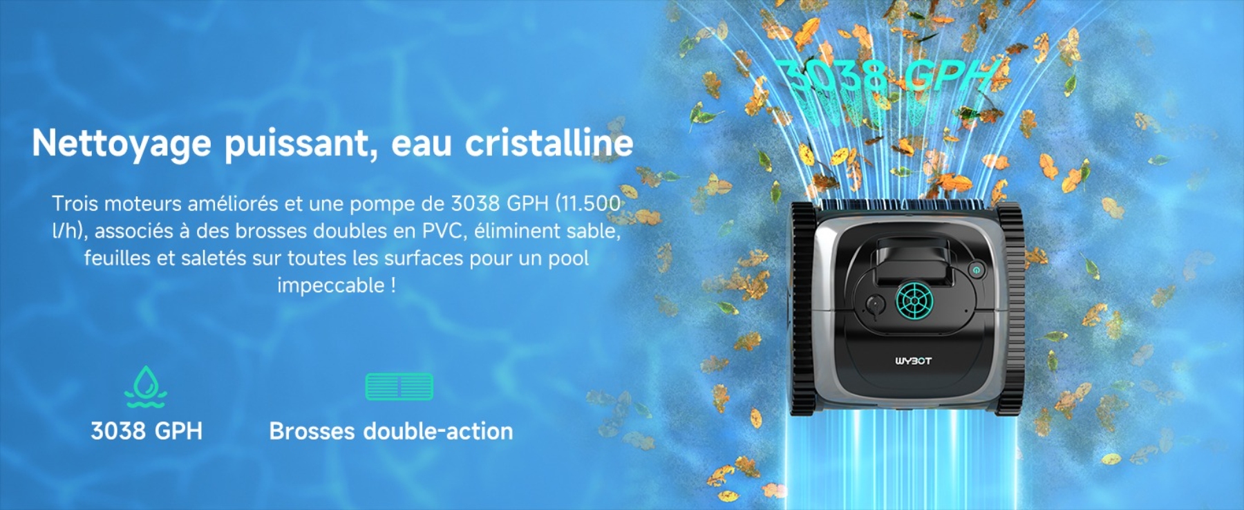 - Moteur haute performance – 2642 GPH, brosses PVC pour toutes surfaces