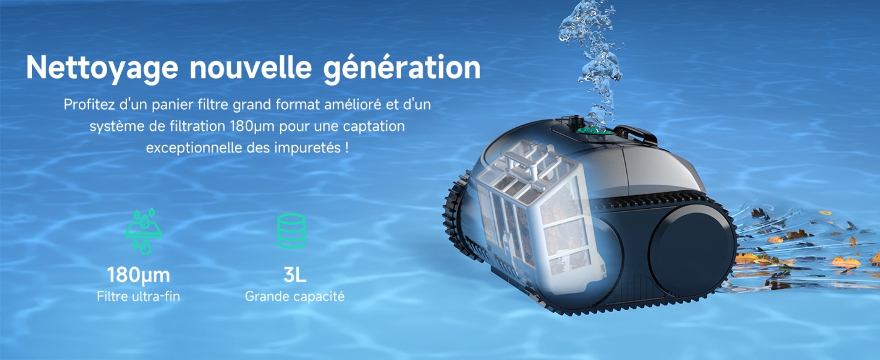 Non. Le robot est conçu pour le nettoyage des débris, et non pour la gestion de la qualité de l'eau ou la filtration ultra-fine. Pour une eau saine et claire, il doit être utilisé en complément du système de circulation et de filtration de votre piscine, ainsi que d'un traitement chimique approprié.