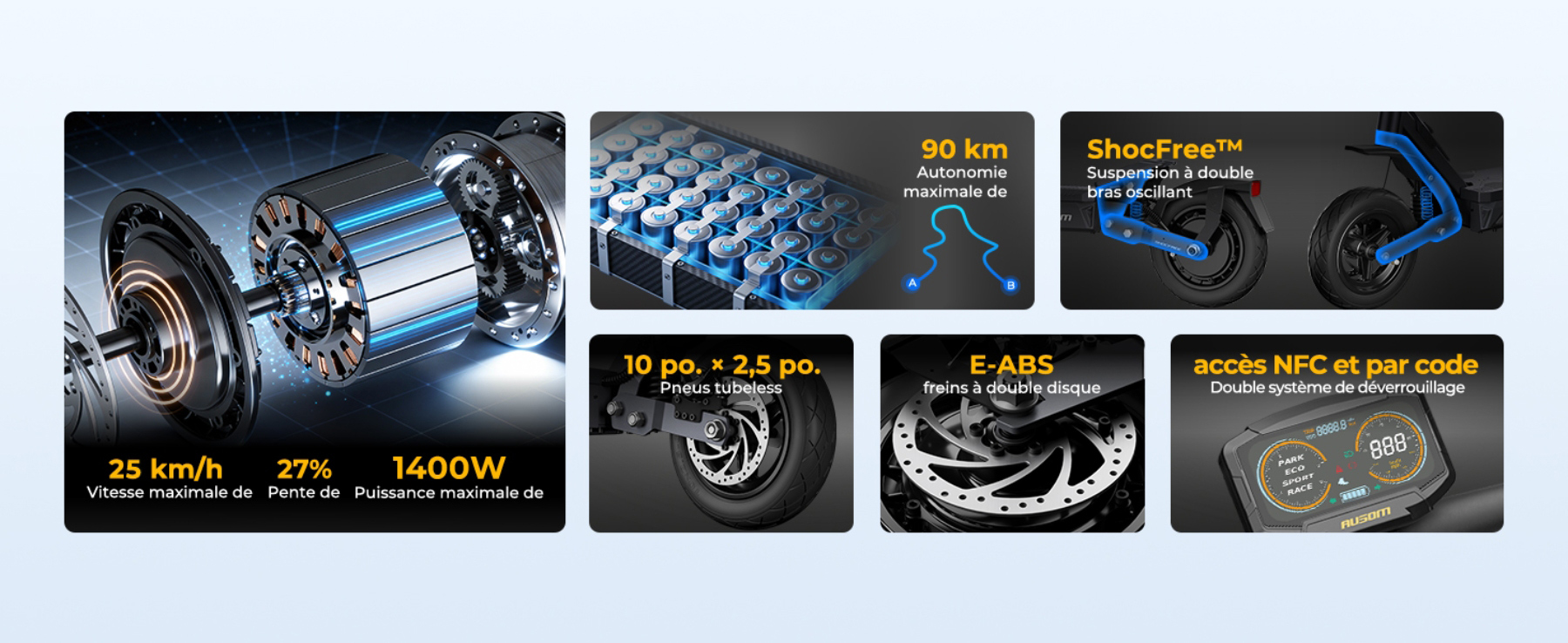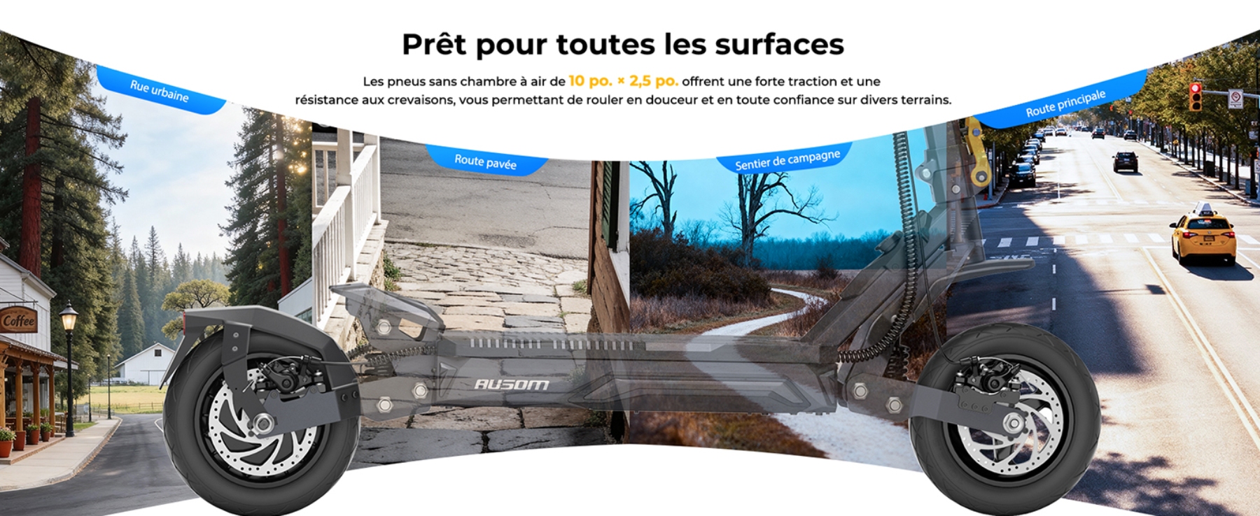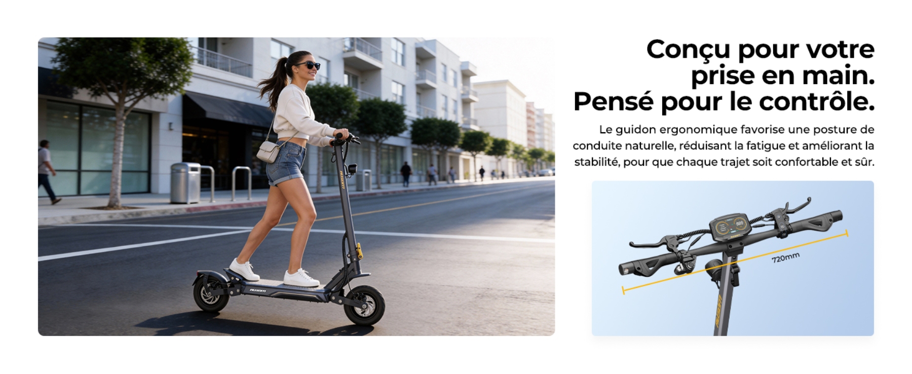- Confort de conduite : Suspension ShocFree et pneus tubeless de 10 pouces pour absorber efficacement les chocs.