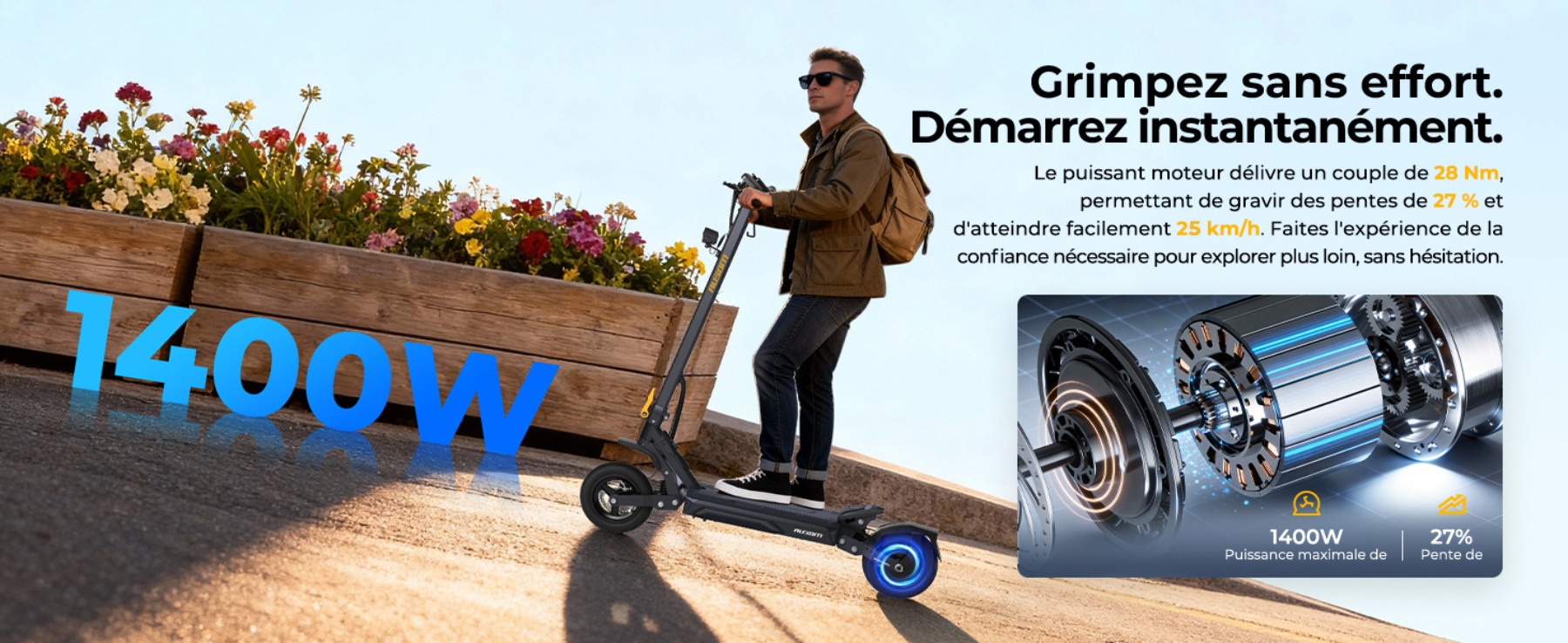 Oui. Entraînée par un moteur haute performance, la trottinette délivre une puissance maximale de 1400W et un couple maximal de 28 Nm. Ces spécifications lui permettent de conquérir avec facilité des pentes raides allant jusqu'à 27 % d'inclinaison. Vous bénéficierez d'une accélération fluide et réactive, parfaitement adaptée aux ponts et pentes de la ville.
