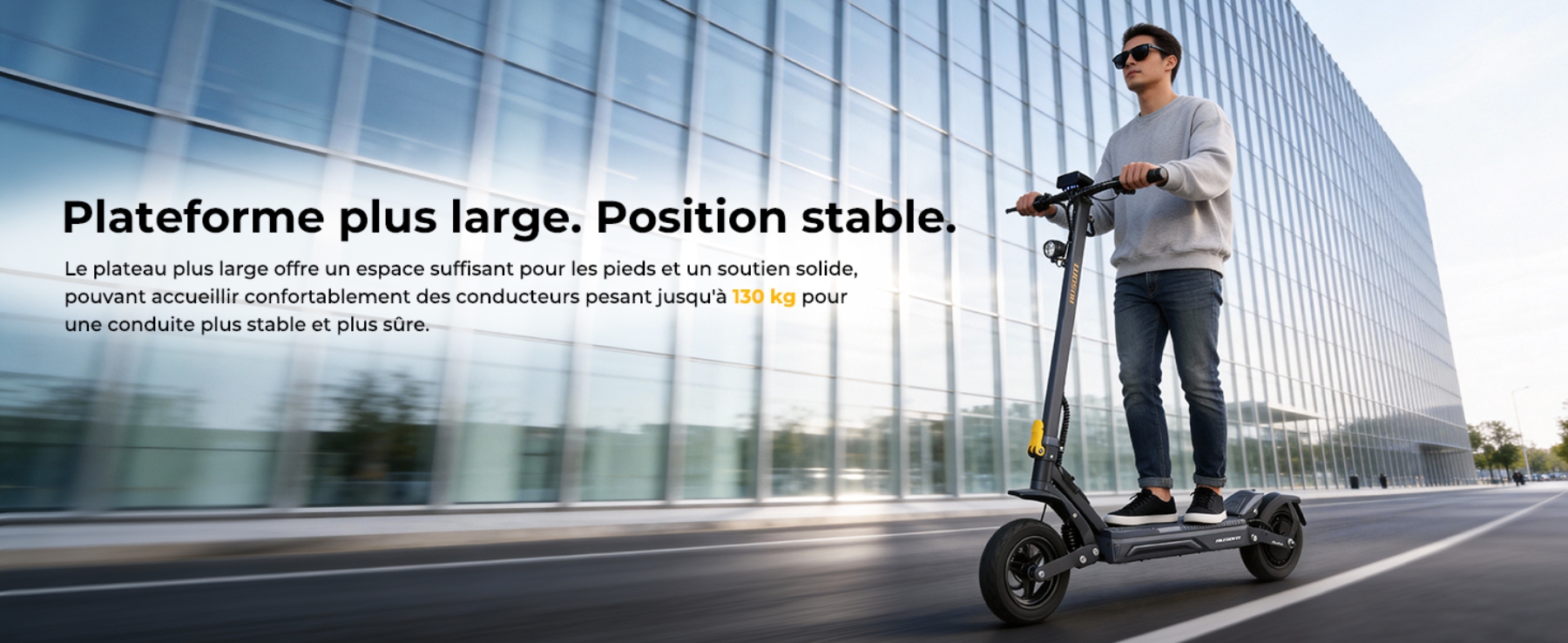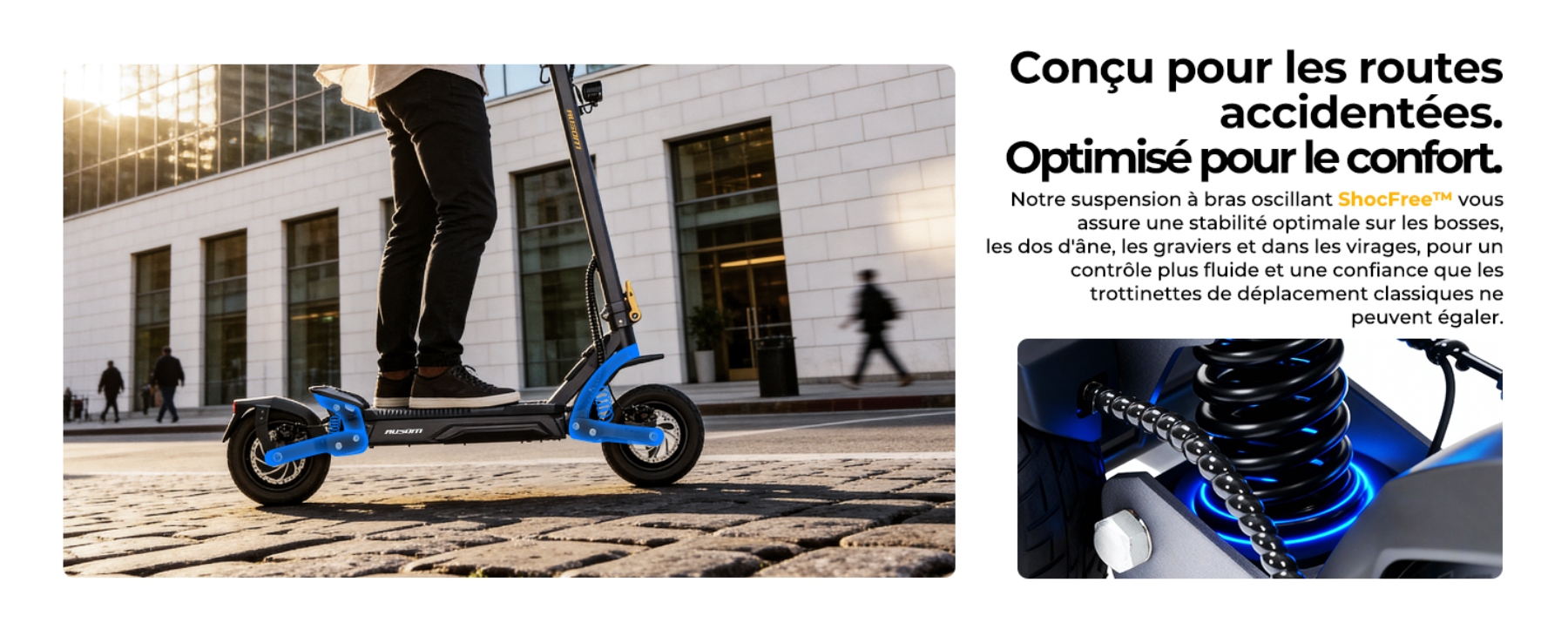 Non, votre confort est assuré. La trottinette est dotée du système de suspension à bras oscillant ShocFree, conçu pour absorber efficacement les chocs et les vibrations sur les terrains inégaux. Couplé à des pneus tubeless en caoutchouc de 10 pouces (taille 10"×2.5") , l'appareil maintient une excellente traction. Cela garantit une conduite plus douce et plus stable face aux nids-de-poule, aux pavés ou aux chemins de gravier.