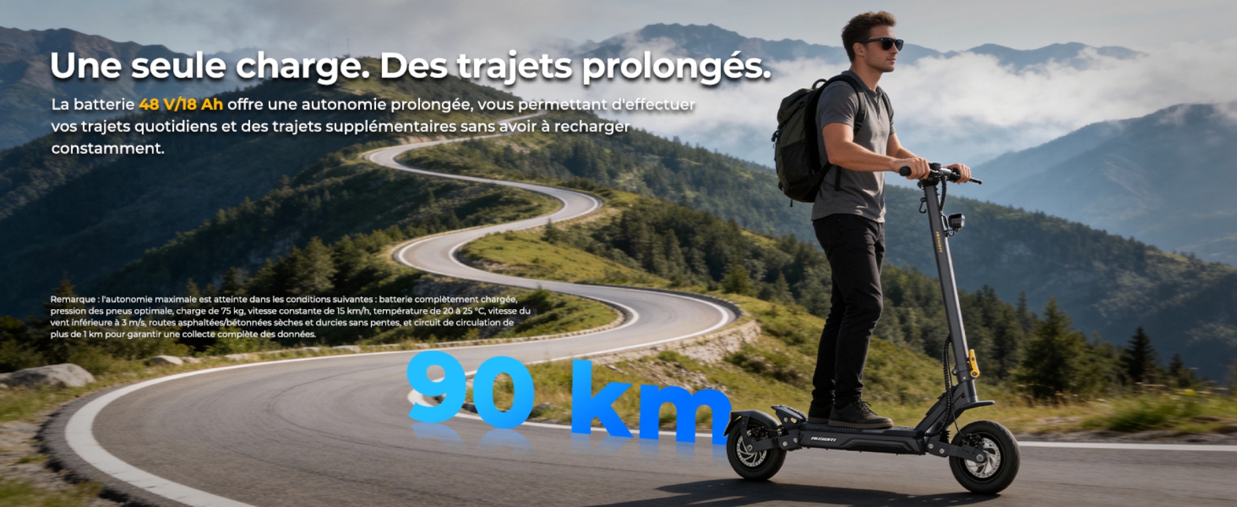 - Autonomie prolongée : Batterie haute capacité de 864 Wh offrant jusqu'à 90 km de trajet avec une seule charge.