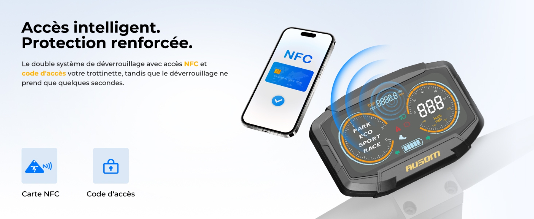 - Sécurité connectée : Double système antivol (NFC et code PIN) couplé à un éclairage intégral pour une visibilité totale.