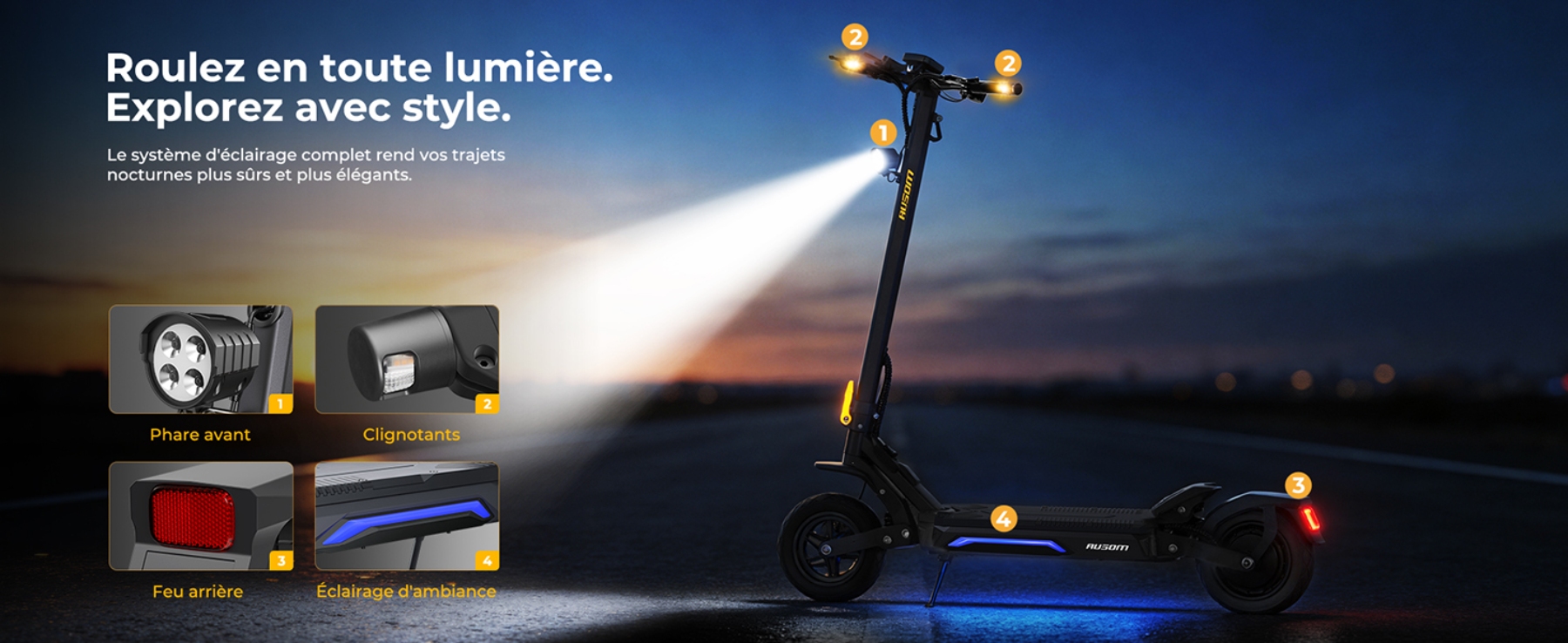 Oui, la visibilité nocturne est optimisée. L'appareil est conçu avec un système d'éclairage complet pour une visibilité totale dans des conditions de faible luminosité. Elle est équipée d'un phare avant lumineux, d'un feu arrière, de clignotants pour indiquer votre direction, ainsi que de lumières d'ambiance, améliorant considérablement votre sécurité.
