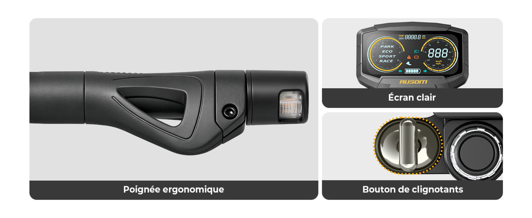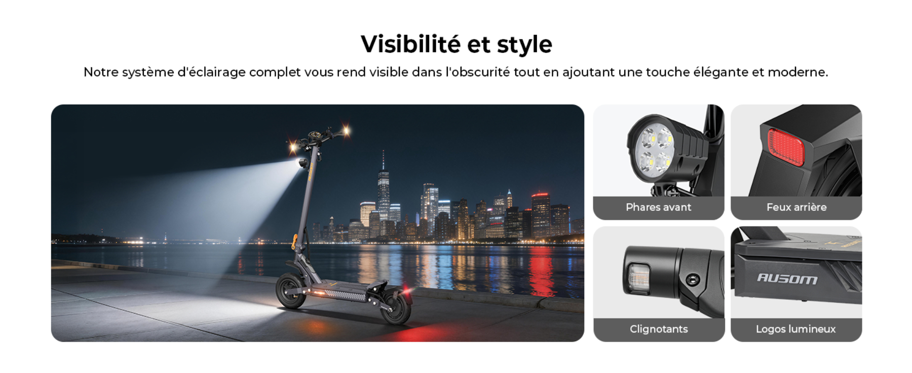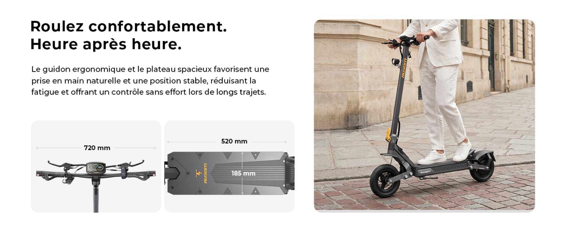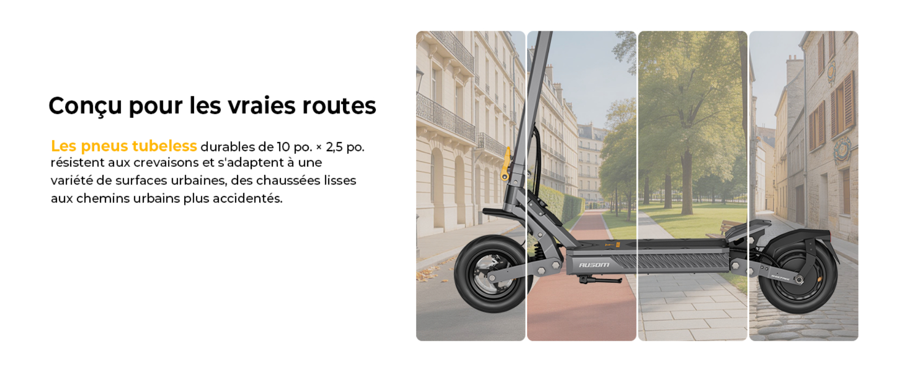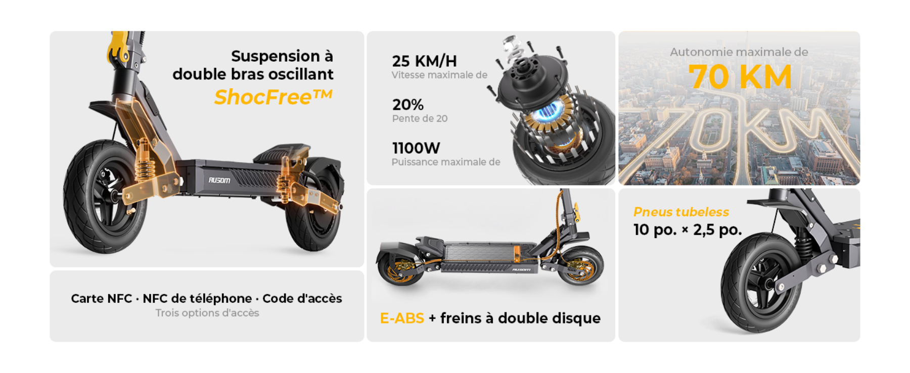 - Confort de conduite : Suspension ShocFree et pneus tubeless de 10 pouces pour absorber efficacement les chocs urbains.