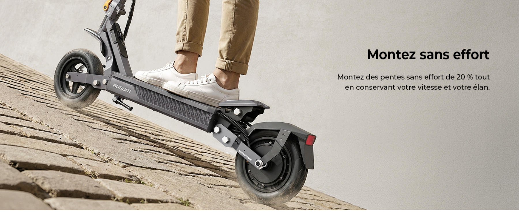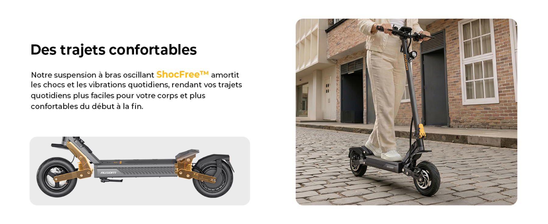 Absolument. La Gosoul 2 est équipée du système de suspension à bras oscillant ShocFree, spécialement réglé pour les trajets urbains. Associé à des pneus tubeless de 10 pouces, ce système absorbe efficacement les impacts liés aux nids-de-poule, aux ralentisseurs et aux routes pavées. Cela garantit une stabilité optimale et un confort comparable à celui d'un SUV lors de vos trajets quotidiens.