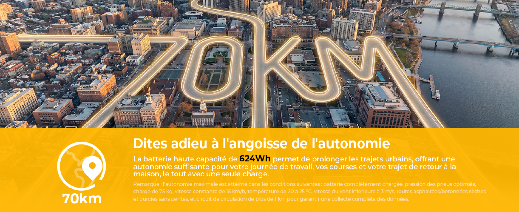 - Autonomie optimale : Batterie de 624 Wh garantissant jusqu'à 70 km de trajet avec une seule charge.