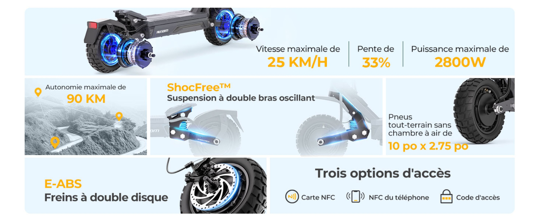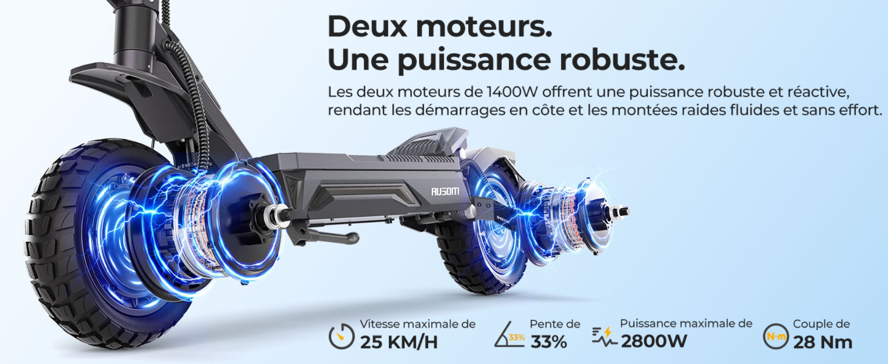 - Double moteur puissant (2800 W max) : Accélération fulgurante et franchissement de pentes jusqu'à 33%.
