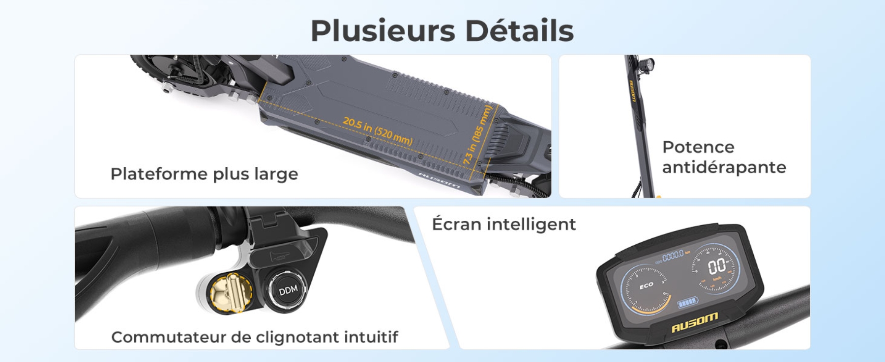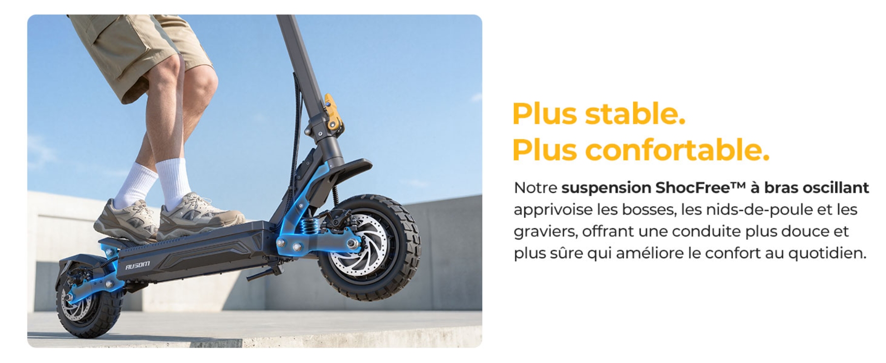 J'utilise cette Ausom pour mes trajets domicile-travail tous les jours et c'est une vraie révolution. Le double moteur de 2800 W est incroyable, il avale les grosses côtes de ma ville sans aucune perte de vitesse. Les pneus de 10'' associés à la suspension ShocFree absorbent tous les nids-de-poule et les trottoirs mal pavés. C'est vraiment sécurisant ! Le plateau large me permet de bien positionner mes pieds. Très satisfait de cet investissement, le rapport qualité-prix est au rendez-vous.