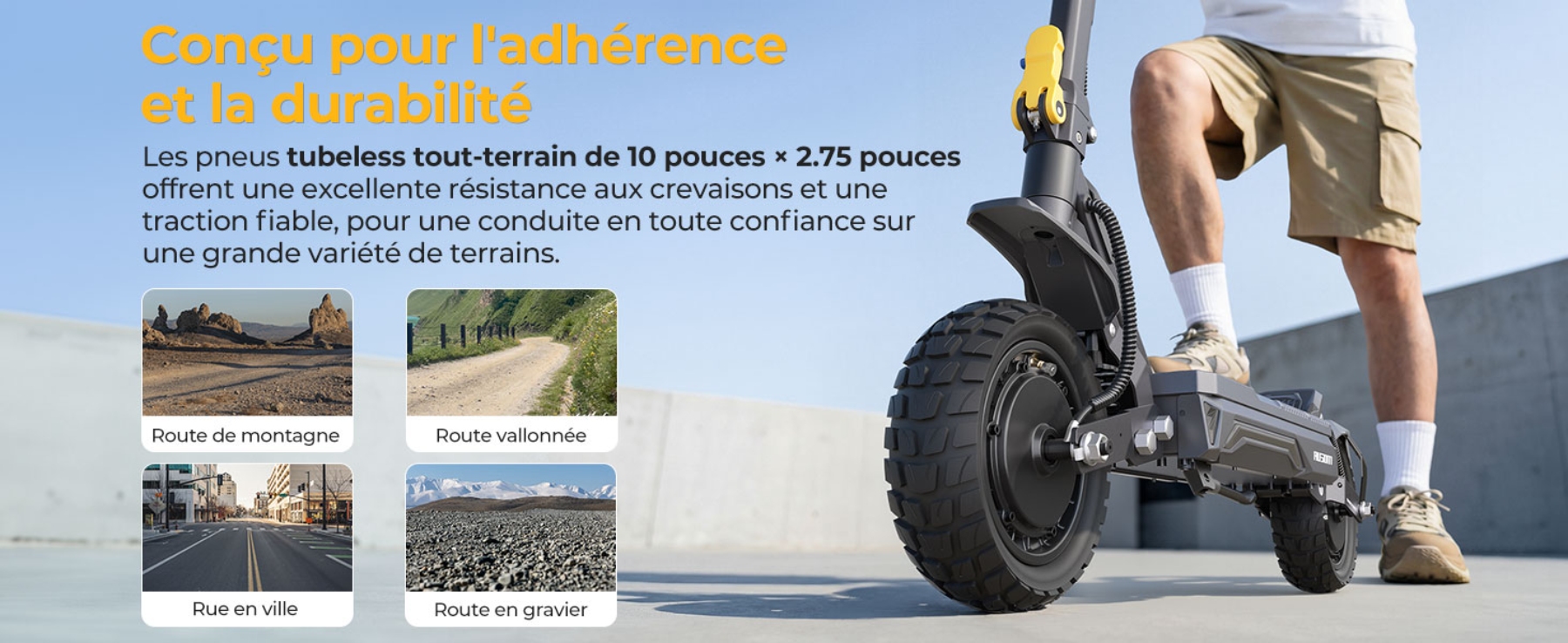 - Confort tout-terrain : Suspension ShocFree et pneus larges tubeless de 10 pouces pour absorber tous les chocs.