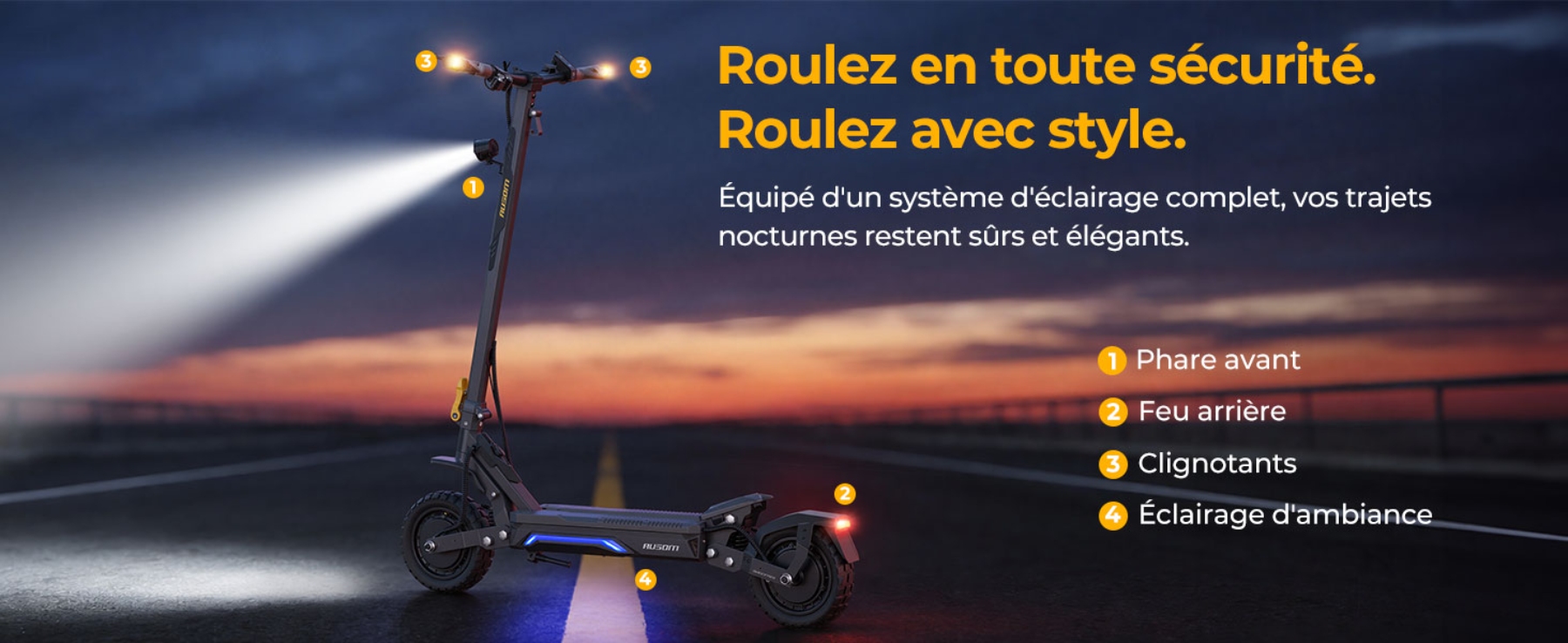 La trottinette est livrée de série avec un système d'éclairage complet incluant un phare avant lumineux, un feu arrière, des clignotants directionnels et des lumières d'ambiance. Ces dispositifs sont calibrés pour accroître la visibilité du conducteur et garantir la sécurité lors des déplacements nocturnes ou par faible luminosité.