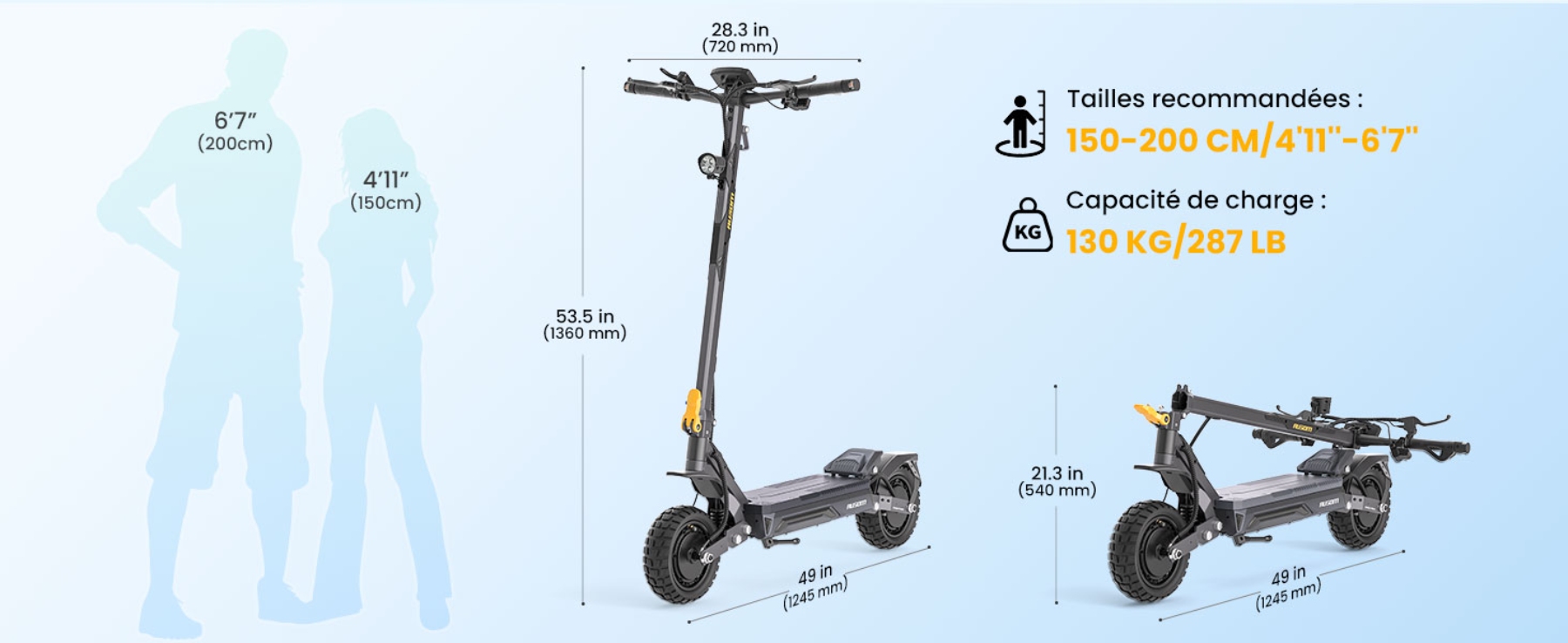 Le cadre en acier (STL) de ce modèle est techniquement certifié pour supporter une charge maximale de 130 kg (287 lbs). De plus, le plateau (deck) est élargi avec des dimensions de 520x185 mm, offrant un espace de positionnement suffisant pour maintenir l'équilibre et la stabilité du conducteur. L'appareil est conçu pour des utilisateurs dont la taille est comprise entre 150 et 200 cm.