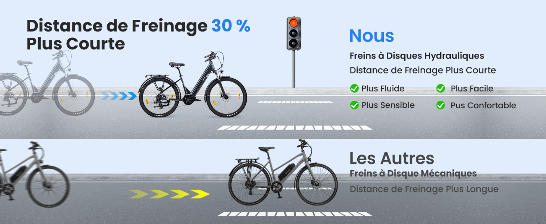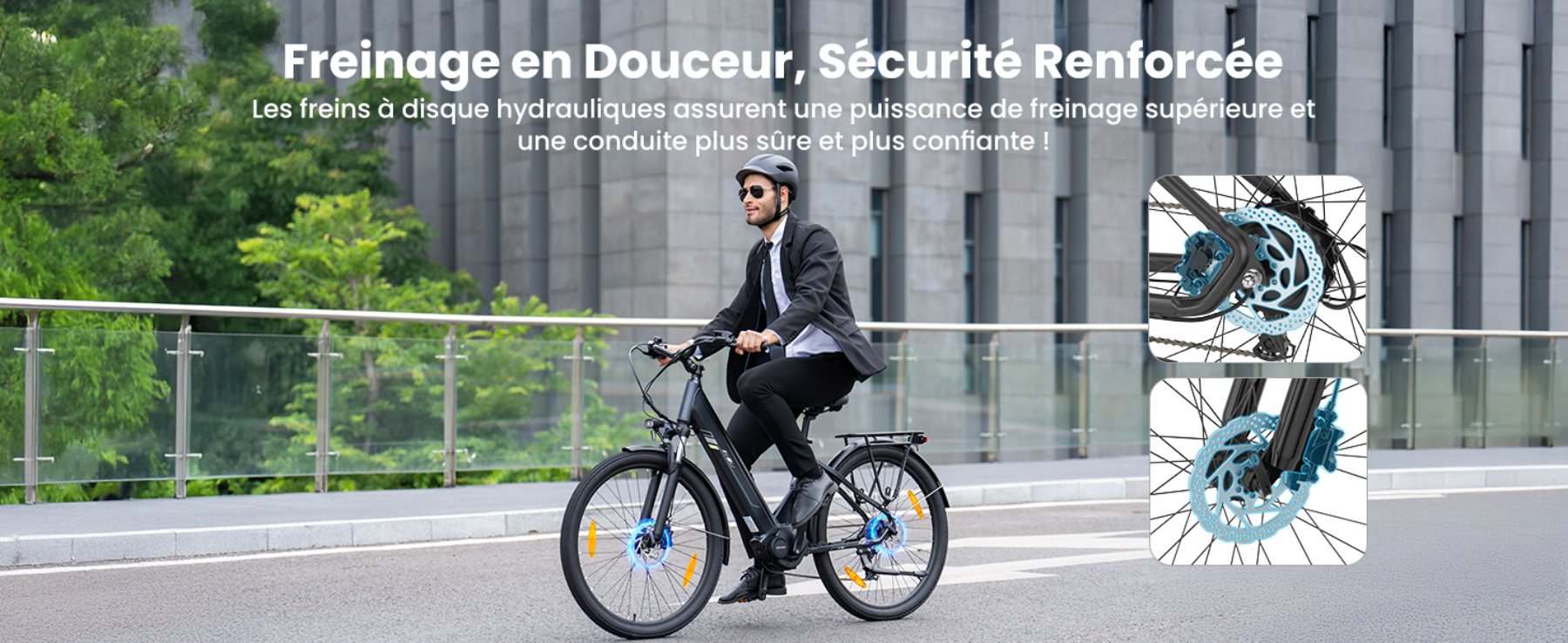 Le vélo électrique Urbano 3 est équipé de freins à disque hydrauliques, offrant des performances de freinage supérieures et stables.La distance de freinage est 30 % plus courte que celle des freins à disque mécaniques, assurant une sécurité plus fiable.Avec l'Urbano 3, vous roulerrez en toute confiance sur des routes mouillées ou accidentées.