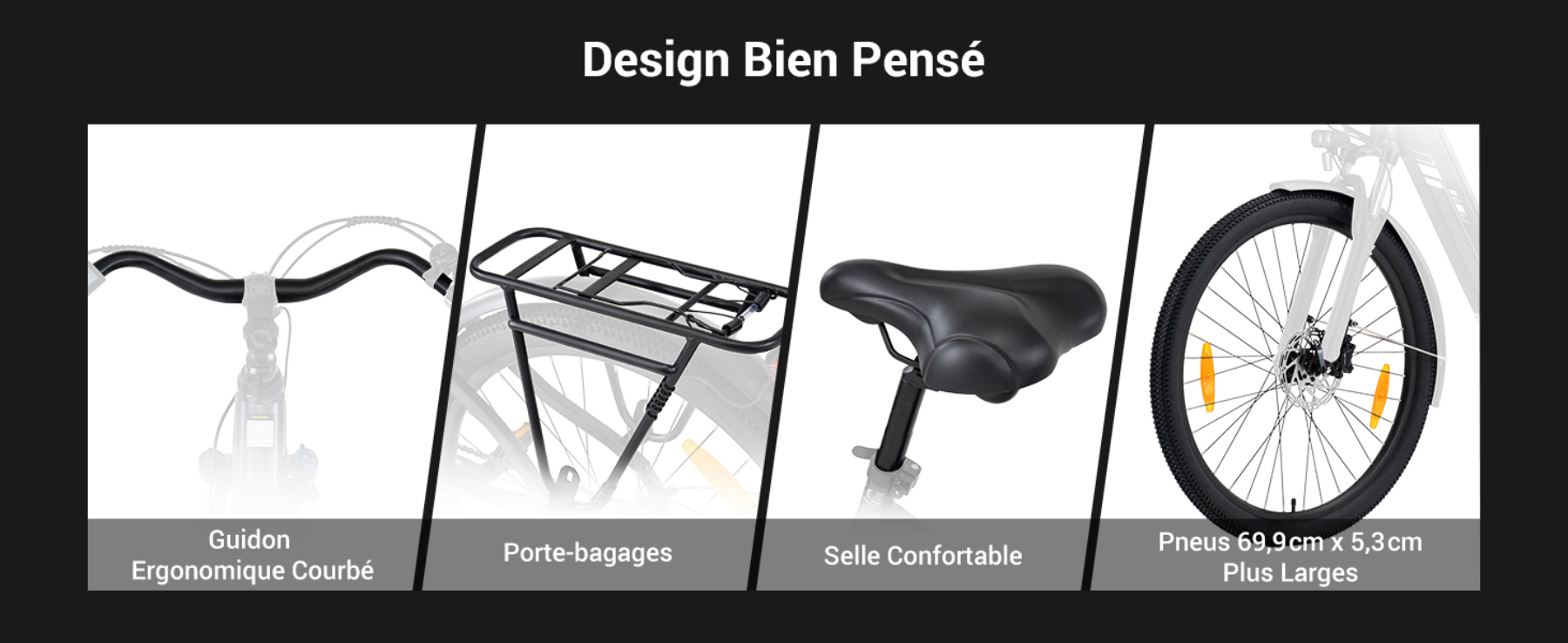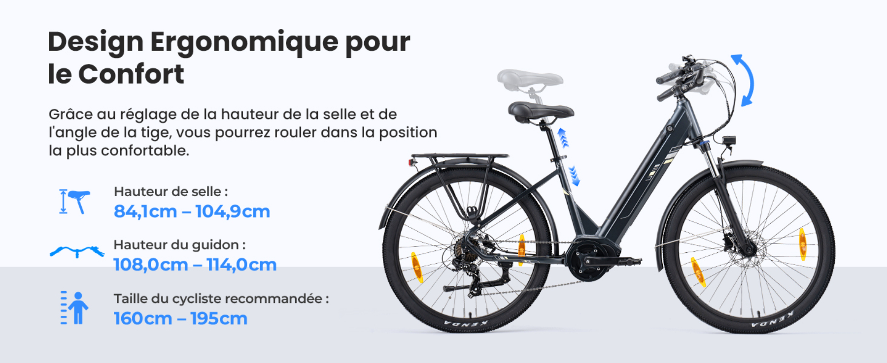 L'Urbano 3 offre une expérience de conduite ergonomique grâce à son siège et son guidon réglables, vous permettant de personnaliser votre position de conduite.La conception confortable du guidon courbé soulage la fatigue des bras lors des longues sorties, et la conception du cadre à cadre ouvert vous permet de monter et de descendre du vélo sans effort.Ces conceptions garantissent une posture naturelle et confortable, rendant chaque trajet agréable et sans fatigue.