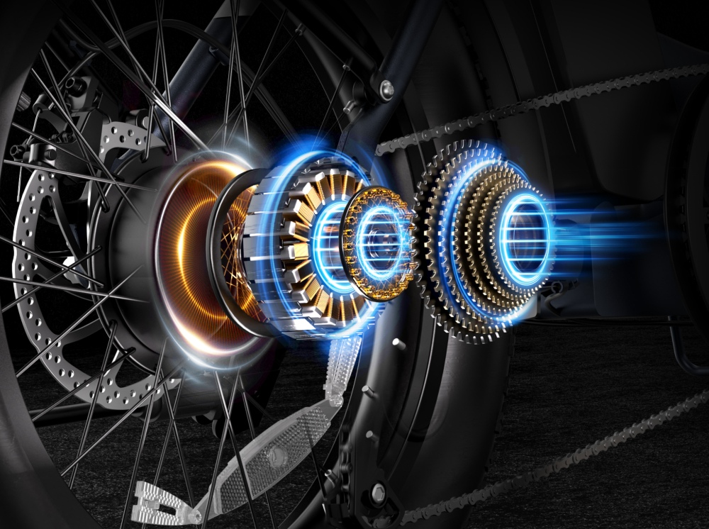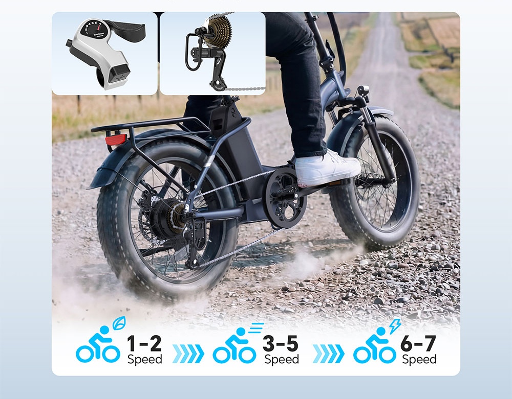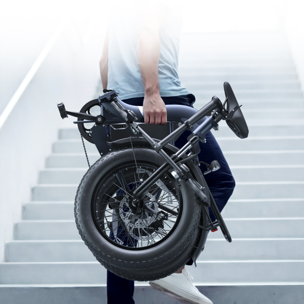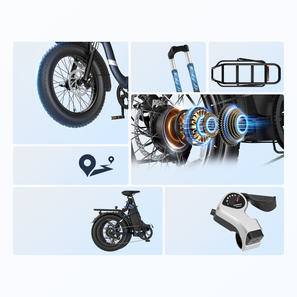 Pneus larges 20x4.0" pour une adhérence optimale sur asphalte, sable, neige et gravier. Moteur 250W (puissance de pointe 650W) et couple de 55 Nm pour gravir les pentes facilement.