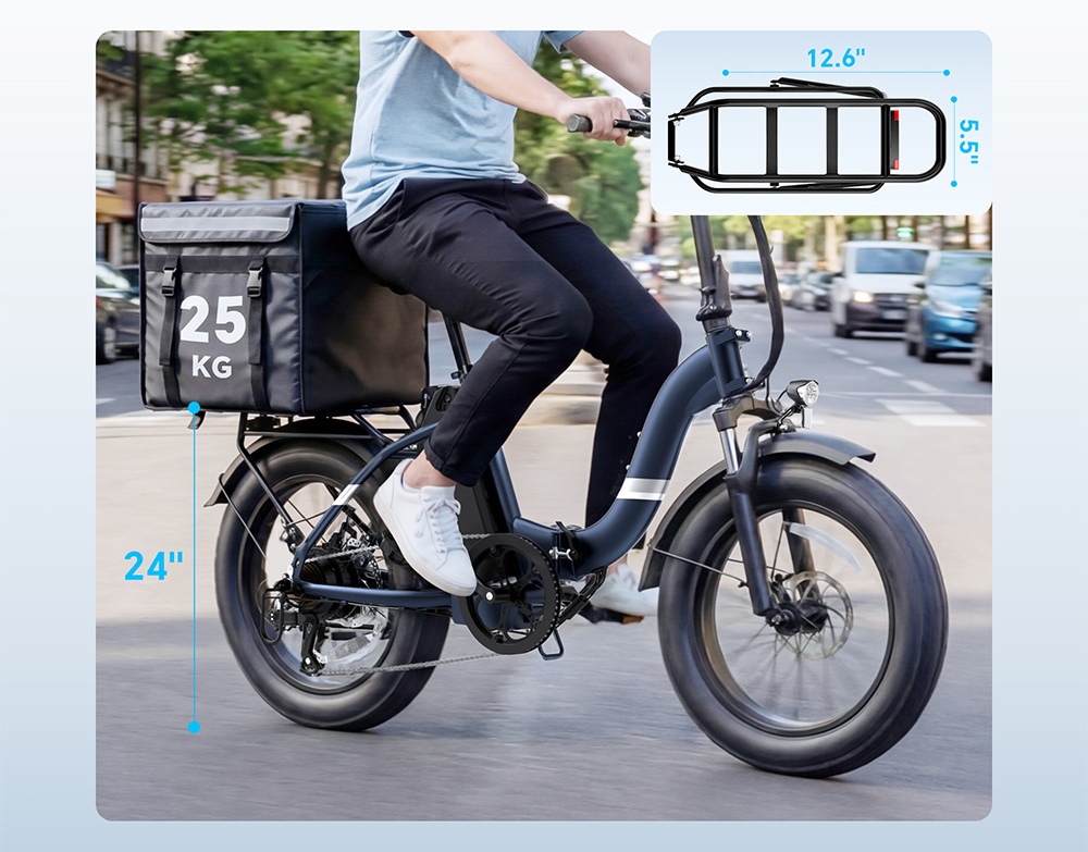 Cadre et potence se plient sans outils pour un rangement compact dans le coffre. Porte-bagages arrière robuste (charge max. 25 kg), idéal pour les livraisons ou les courses.