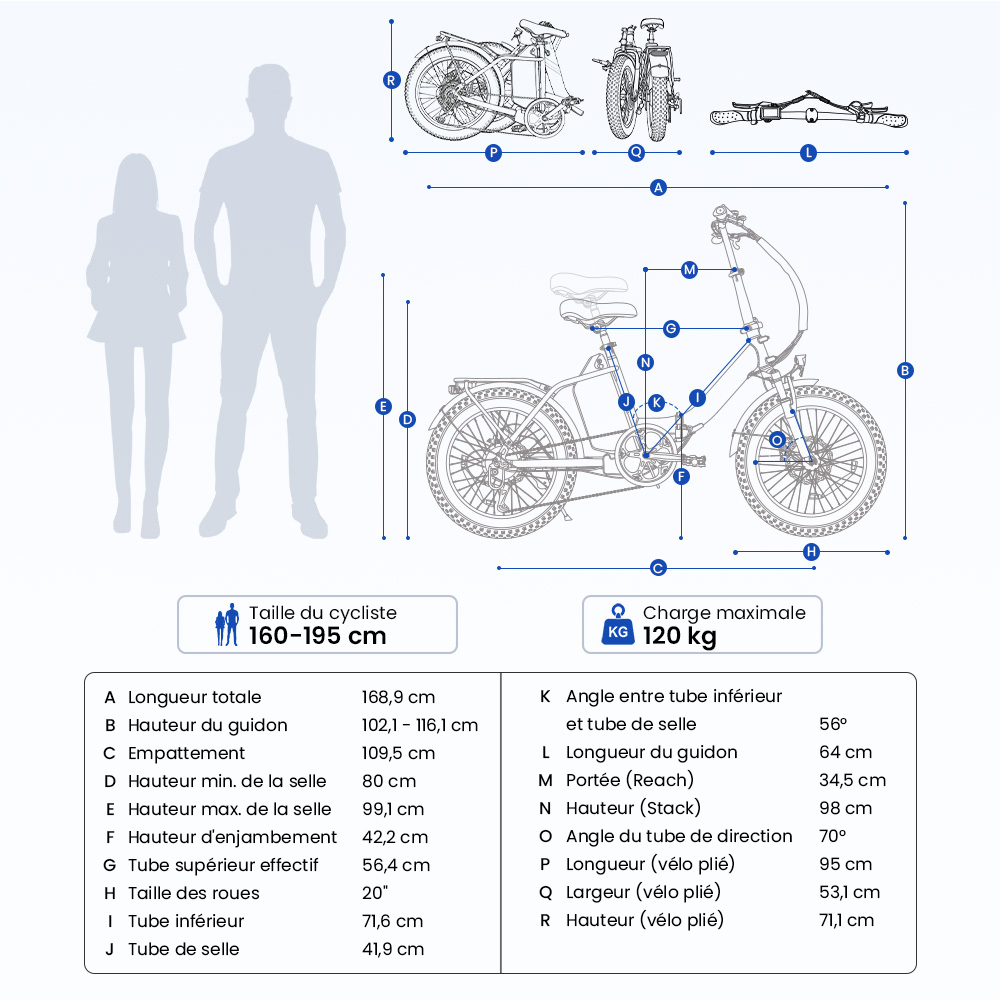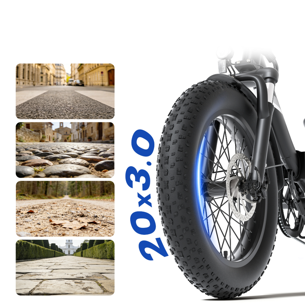 - Pneus 20"x3.0" : Les pneus larges tout-terrain assurent une conduite stable et confortable sur toutes les surfaces.