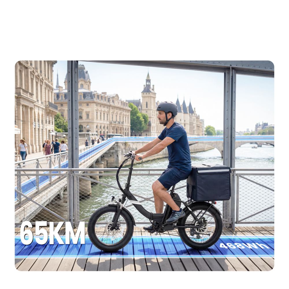 - Autonomie 65 km : La batterie amovible de 468 Wh garantit une énergie fiable pour vos longs trajets.