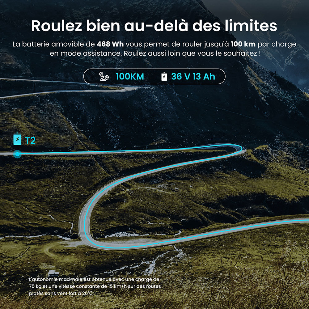 - Autonomie 100 km : Batterie lithium-ion 468Wh (36V 13Ah) pour une autonomie max de 100 km en mode assistance. Batterie amovible, design intégré et protection contre les éclaboussures.