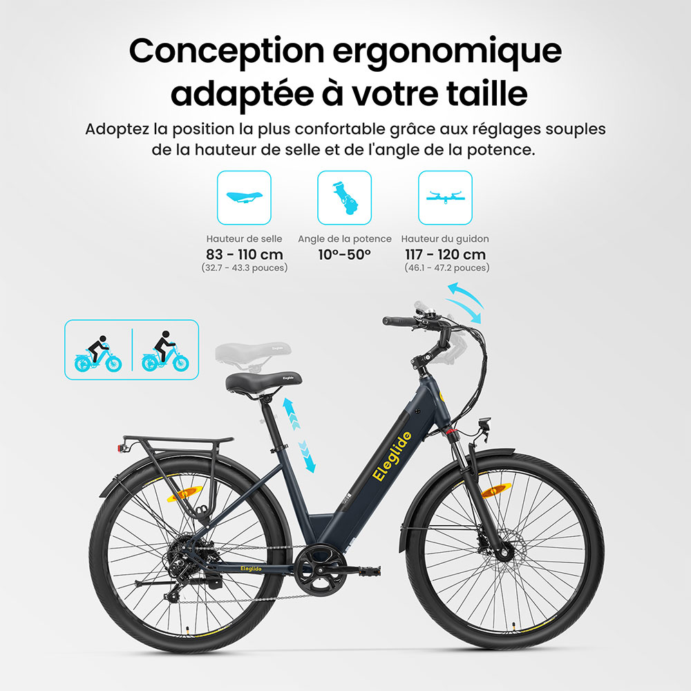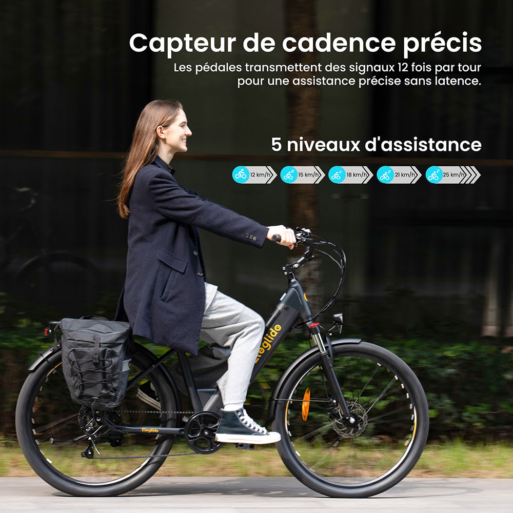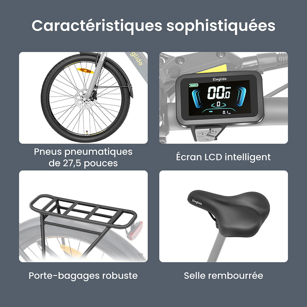 Écran LCD affichant vitesse, distance et batterie. 5 niveaux d'assistance (12-25 km/h) et mode marche 6 km/h. Application Eleglide pour verrouillage, mot de passe et réglages supplémentaires.