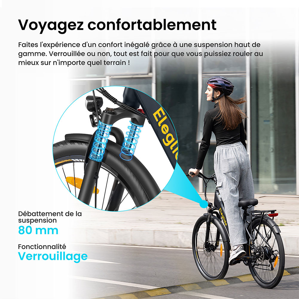 Fourche suspendue verrouillable 80 mm absorbe les chocs et améliore la stabilité. Potence et selle réglables pour une position personnalisée. Guidon ergonomique incurvé pour les longs trajets.