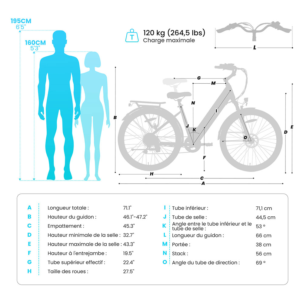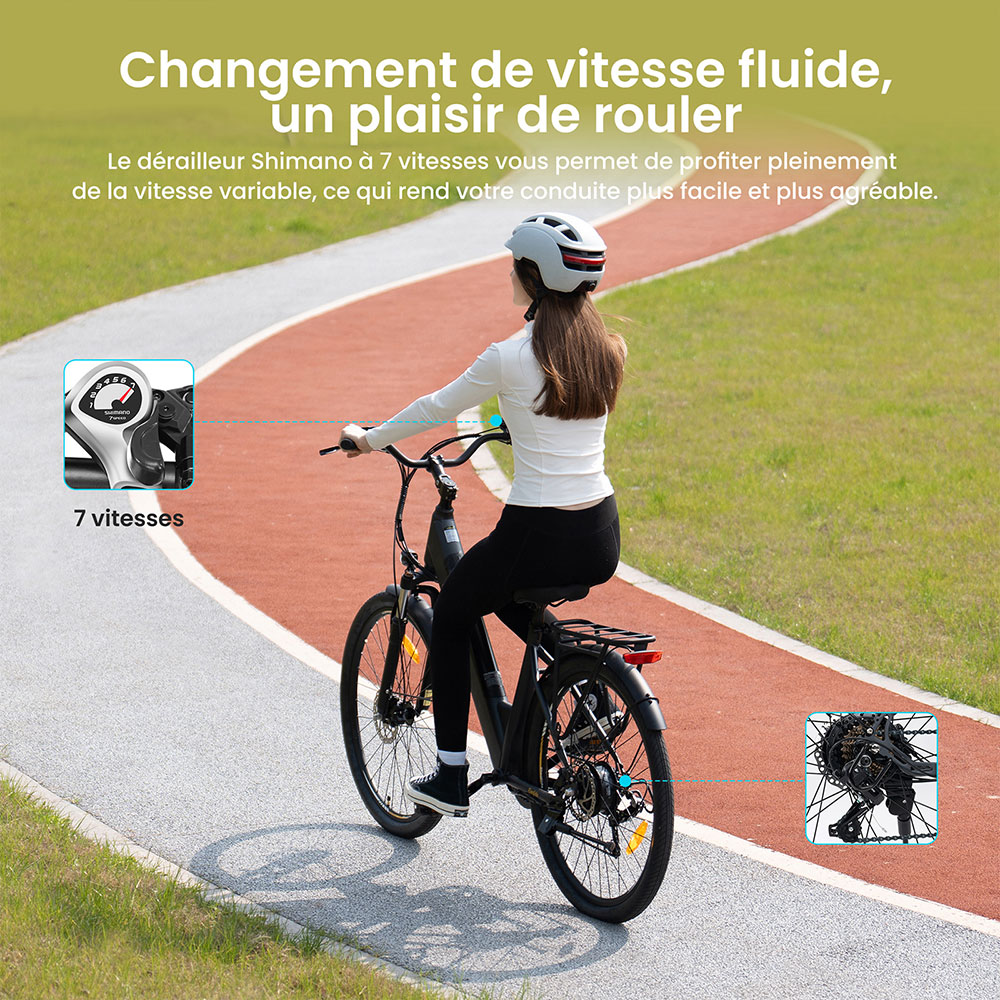 - Moteur performant : Moteur 250W (couple 45 Nm) avec capteur de cadence 12 aimants, 5 niveaux d'assistance (12-25 km/h). Transmission Shimano 7 vitesses.