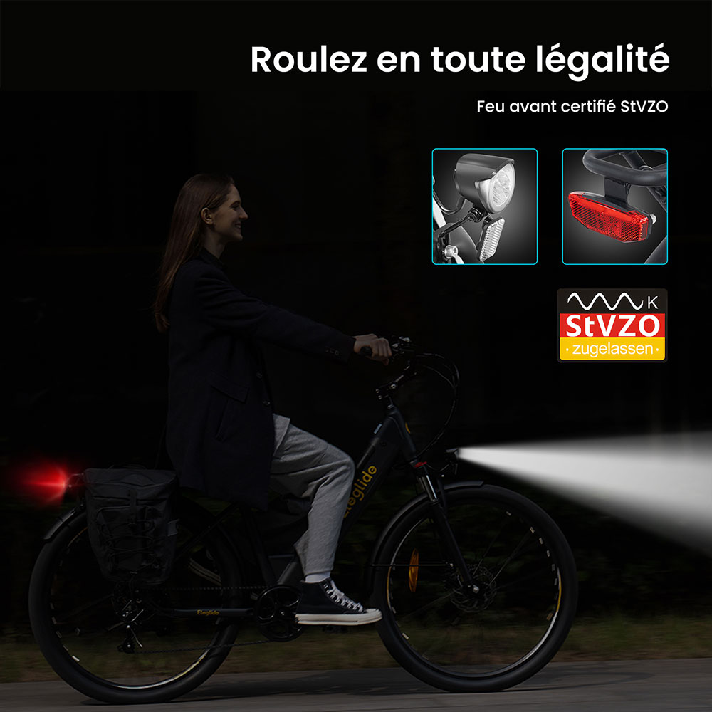 - Contrôle intelligent :Écran LCD 2.6" et application Eleglide (verrouillage, mot de passe). Éclairage certifié StVZO.